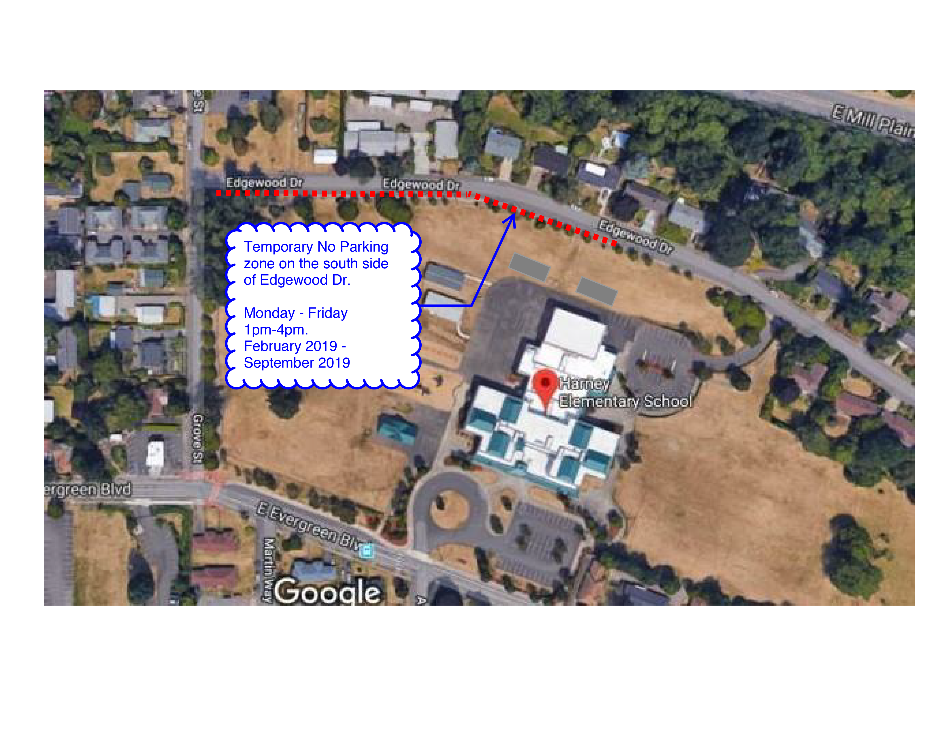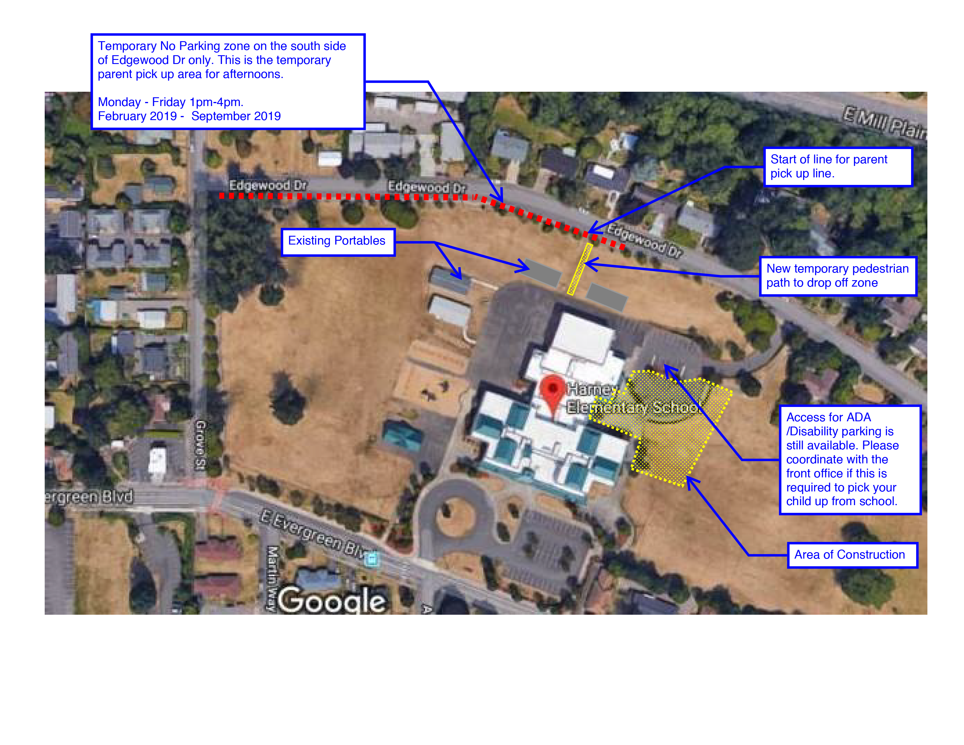 - Starting on March 4th, instead of entering the north lot to pick up your child(ren) from school at the end of the day, please wait along the south side of Edgewood Drive until the bell rings. The city will place temporary no parking signs along this portion of the road to allow for student pickup. Please see the attached map for clarification.